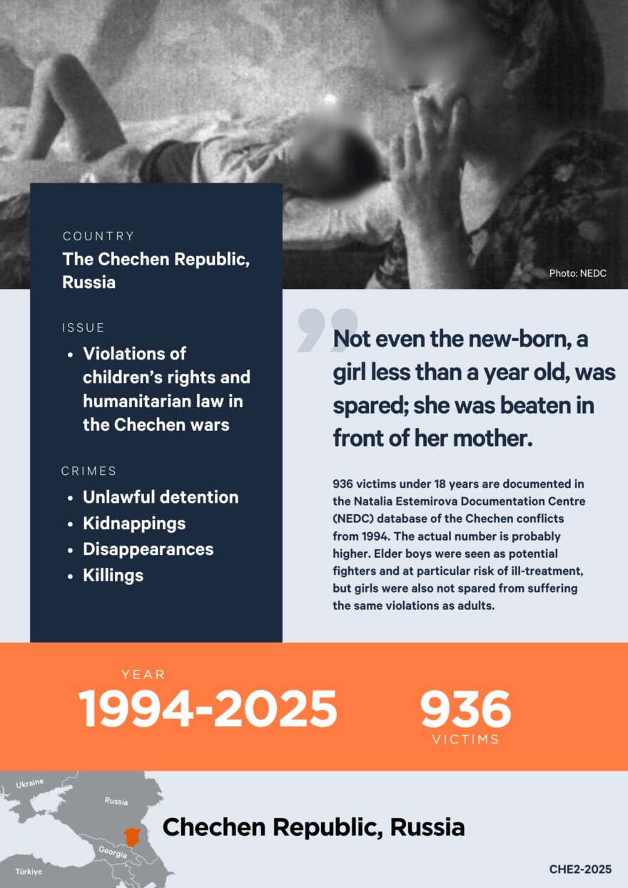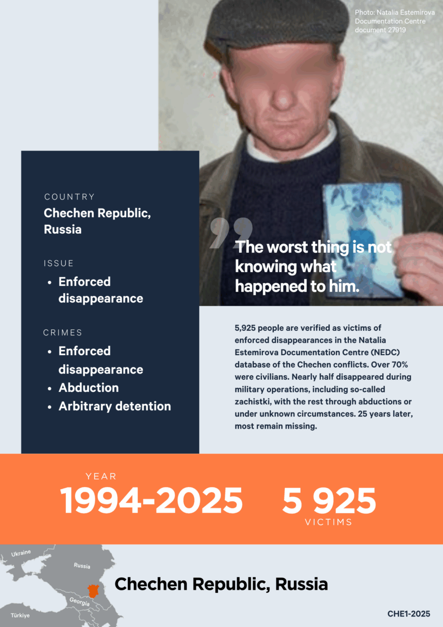 The first internal armed conflict in Chechnya took place from 1994 to 1996. The military phase of the Second war, and the years afterwards, have been characterized by severe and systematic violations of international law carried out with impunity. The Natalia Estemirova Documentation Center (NEDC) is the world’s largest evidence database of crimes from 1994 up to now.